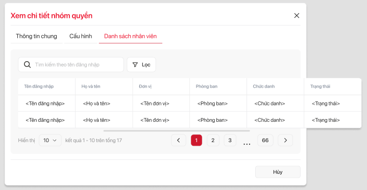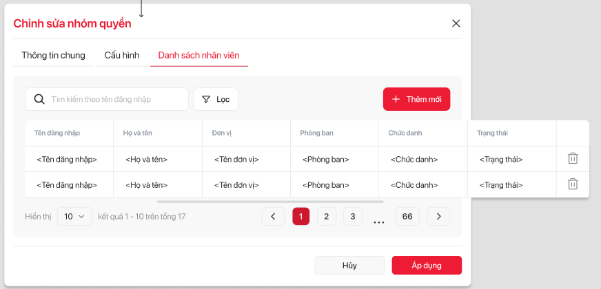 | 7 | Nhân viên | icon | Hiển thị thông tin chi tiết nhóm quyền Tab Danh sách nhân viên | ||