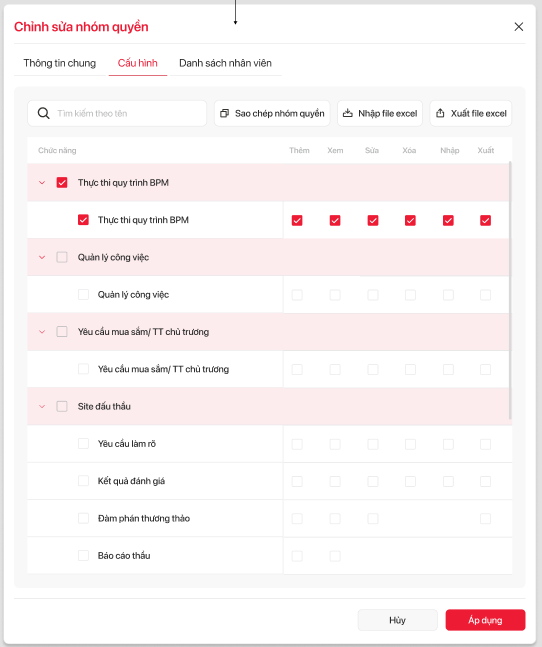 - Tôi muốn người dùng import được cấu hình của từng nhóm quyền vào hệ thống