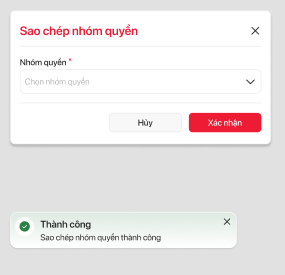 | 4 | Xác nhận | Button | Hiển thị thông báo toast: :" Thành công- Sao chép nhóm quyền thành công" Hiển thị thông tin tích chọn của nhóm quyền đang thực hiện cấu hình tương ứng với cấu hình của nhóm quyền sao chép được chọn |