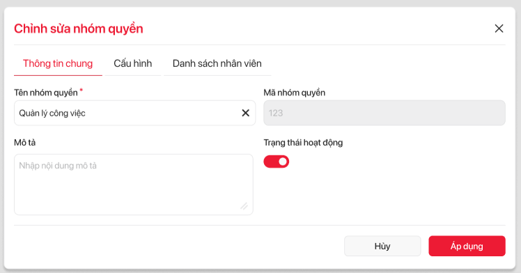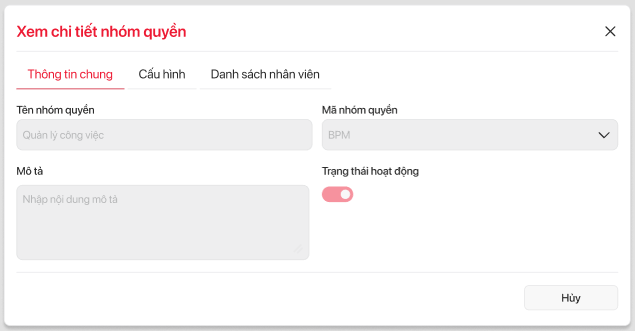 | 6 | Cấu hình | icon | Hiển thị thông tin chi tiết nhóm quyền Tab Cấu hình cho nhóm quyền | ||