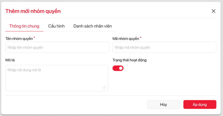 | 13 | Áp dụng | Button | Add thông tin người dùng được tích chọn vào danh sách nhân viên đang hiển thị tại nhóm quyền |