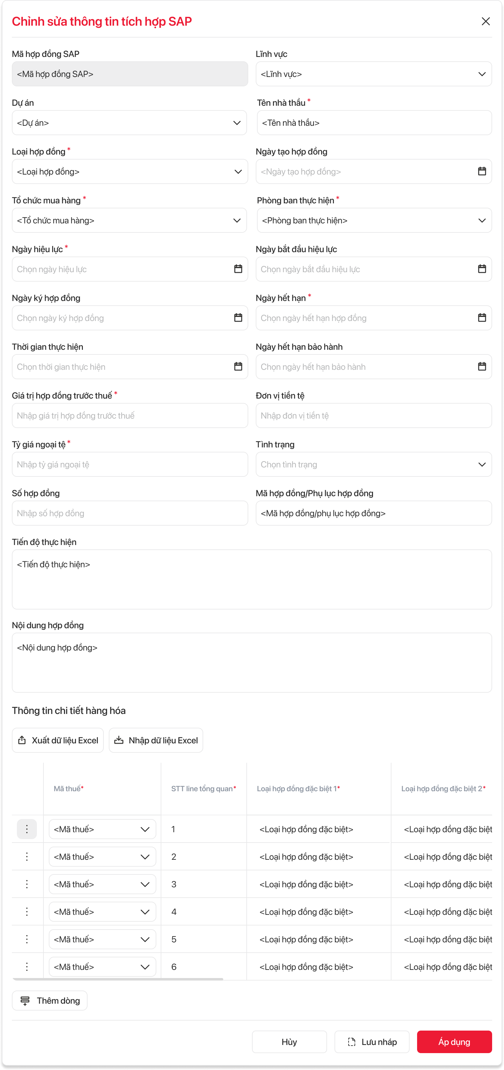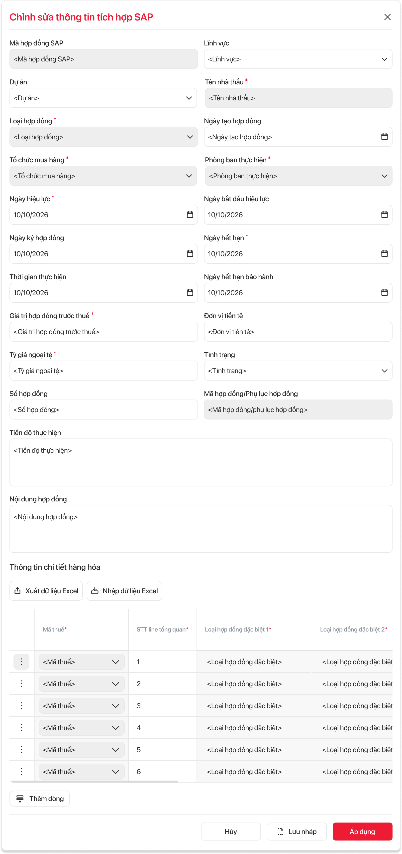 → Hệ thống cho phép người dùng chỉnh sửa thông tin hợp đồng và thực hiện đồng bộ cập nhật lên SAP các trường như bên dưới.