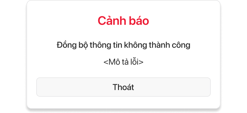 • Hệ thống hiển thị màn hình pop-up Cảnh báo: Đồng bộ thông tin không thành công <chi tiết lỗi>