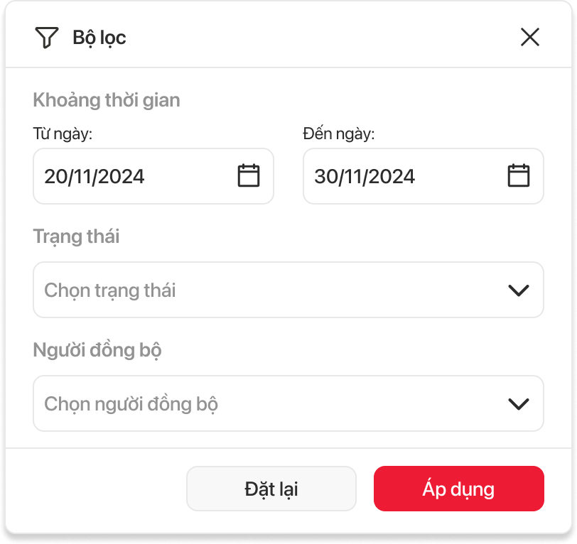 | 1 | Khoảng thời gian | Ngày tháng năm (Date picker) | Không bắt buộc | Cho phép người dùng chọn khoảng thời gian từ ngày đến ngày đồng bộ | Thể hiện thời gian lọc từ ngày đến ngày |