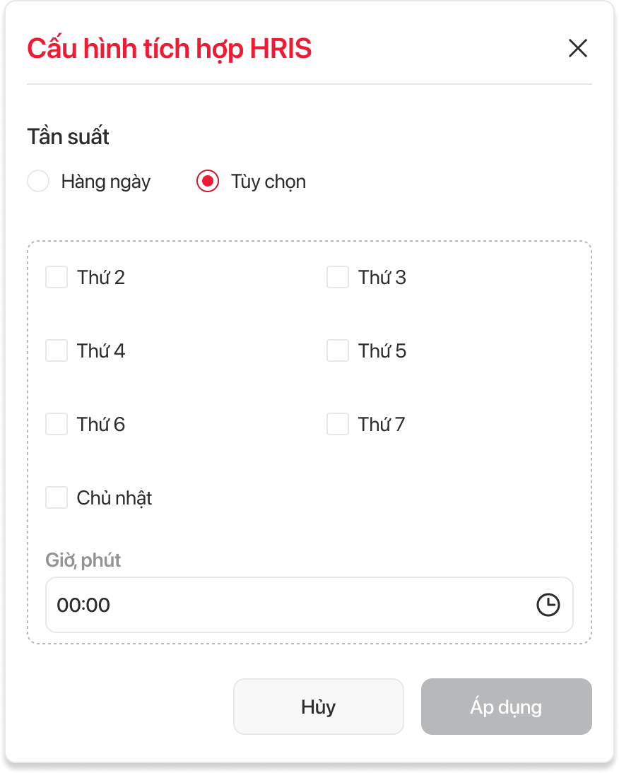 | 2 | Tần suất | Nhãn hiệu (Label) | Chỉ được chọn 1 trong 2 giá trị tần suất đồng bộ thông tin từ HRIS: