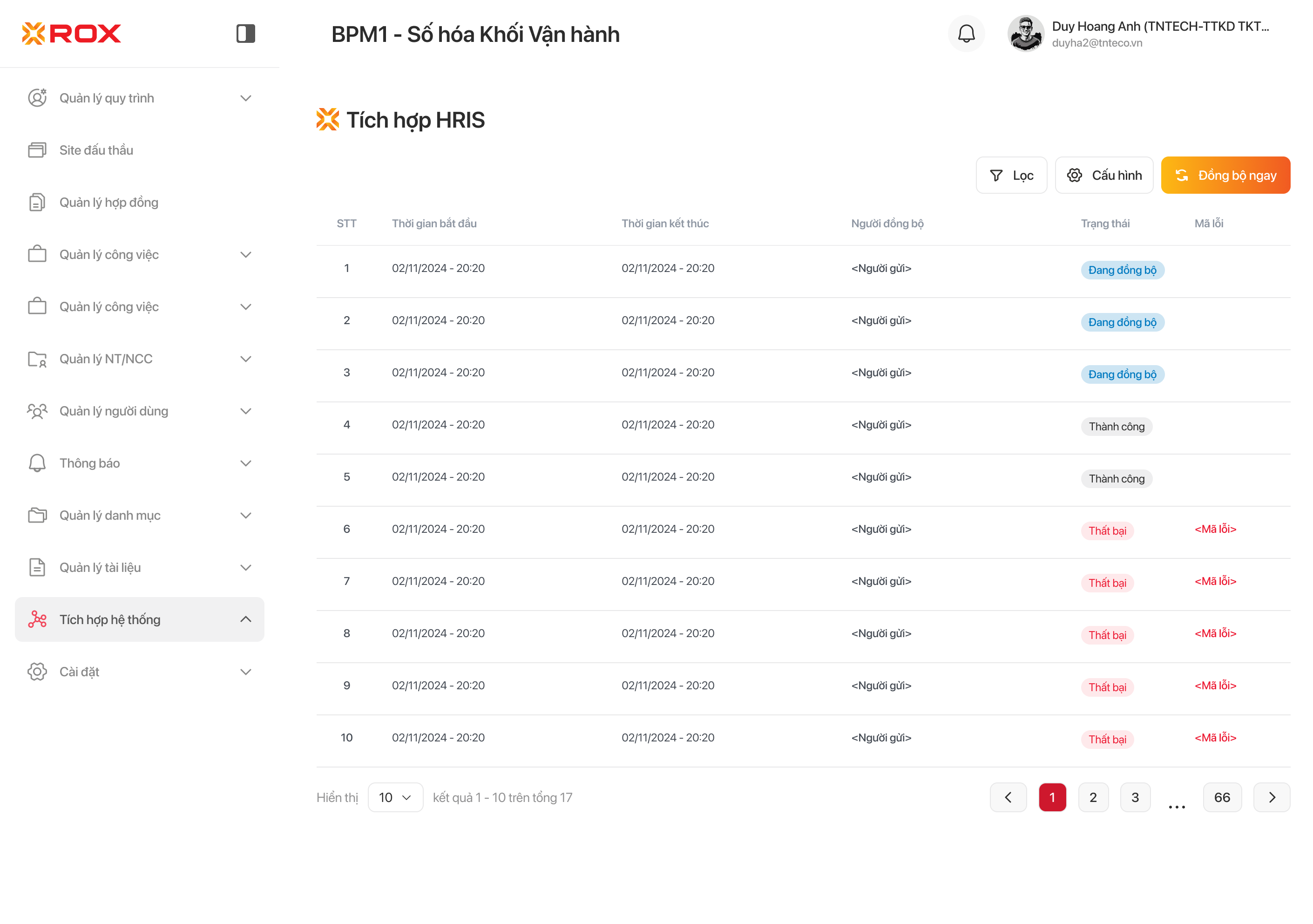 | 2 | 162 | "Đồng bộ HRIS Employee thất bại: <log hệ thống>." |