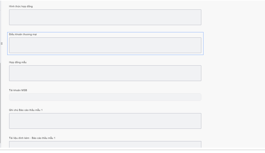 | 6 | Hình thức hợp đồng | Text area | 5000 | Chỉ xem | Trường thông tin nhập thông tin về hình thức hợp đồng | |