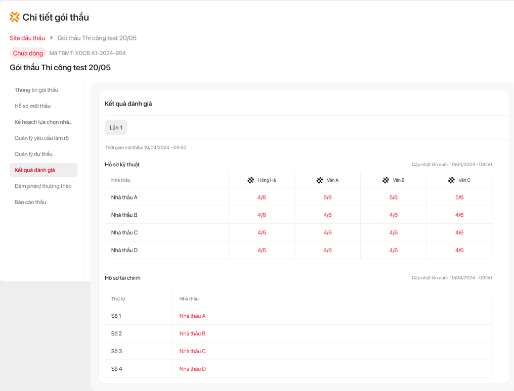 - Cho phép người dùng xem kết quả đánh giá hồ sơ dự thầu. Quyền xem hồ sơ tài chính dựa trên việc thư ký HĐT lựa chọn mở thầu có kèm Hồ sơ tài chính (toggle tại Pop-up mở thầu)