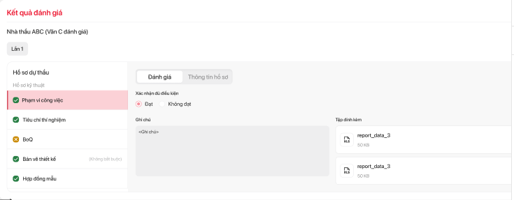 | 3 | Hồ sơ kỹ thuật - Tên nhân sự | Text | Hiển thị tên nhân sự đánh giá nhà thầu | ||