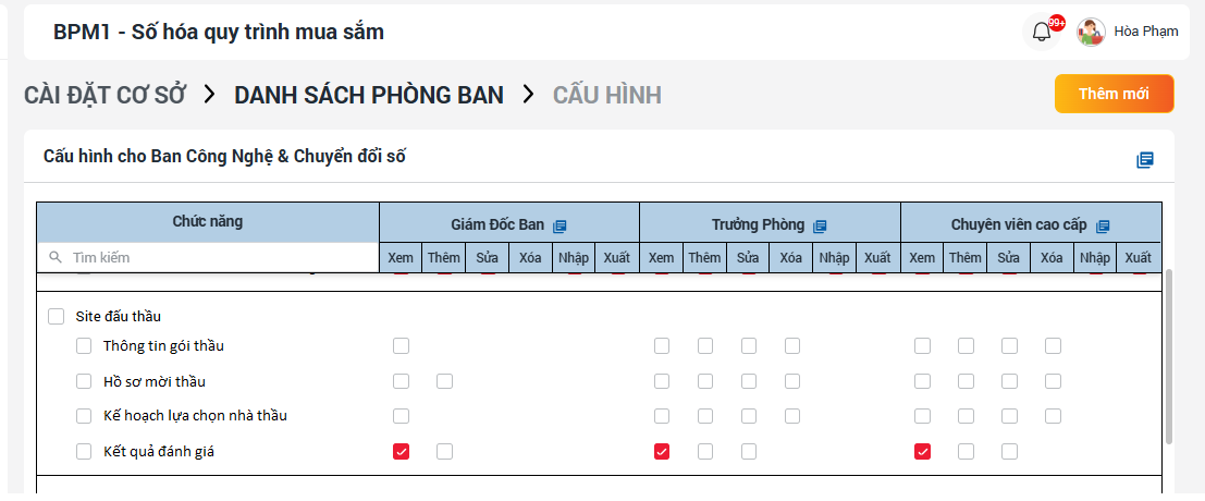 Màn hình kết quả đánh giá là một đối tượng phân quyền tại chức năng: Quản lý người dùng > Quản lý cơ sở > Danh sách phòng ban > Cấu hình phân quyền