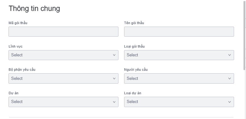 | 6 | Bộ phận yêu cầu | Droplist | Trường thông tin bộ phận yêu cầu Kế thừa từ bước Thư ký HĐT lập báo cáo thầu Không thể chỉnh sửa | ||