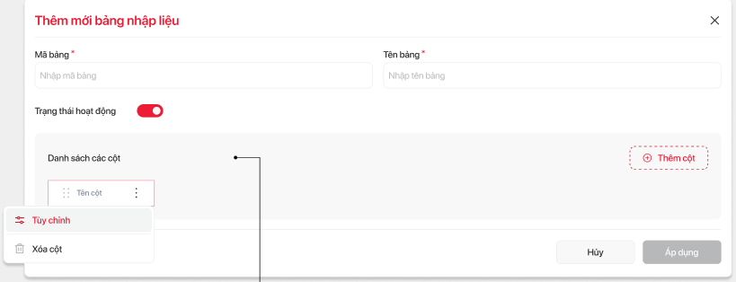 Màn hình thêm mới bảng nhập liệu - Lựa chọn Tùy chỉnh/xóa cột