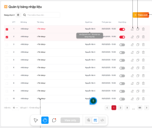 - Tại màn hình danh sách Bảng nhập liệu: Hiển thị nút chức năng "Xóa", "Lựa chọn hàng loạt", "Xóa hàng loạt"