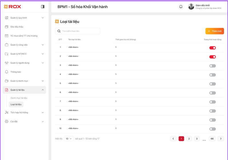 - Trạng thái: chờ phê duyệt/ phê duyệt (Khi upload file trong quy trình đi theo từng file có toggle xác nhận file đó có cần phê duyệt hay không. Nếu cần phê duyệt thì ở trạng thái chờ phê duyệt/phê duyệt, nếu ko cần phê duyệt thì mang tính chất tham khảo, để trường trạng thái null).