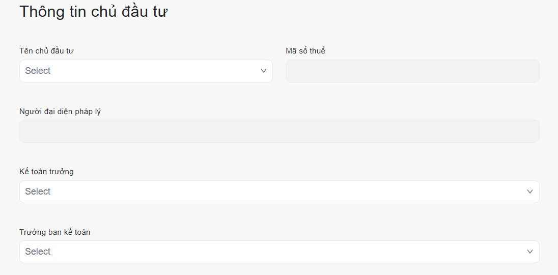 20 | Kế toán trưởng | Droplist | Không cho phép thêm mới/sửa/xóa dữ liệu | - Hiển thị kế toán trưởng của CĐT - Dữ liệu được lấy theo trường Kế toán trưởng từ 2442 - User Story - Nhân viên kế hoạch - tổng hợp soạn thảo hợp đồng | ||