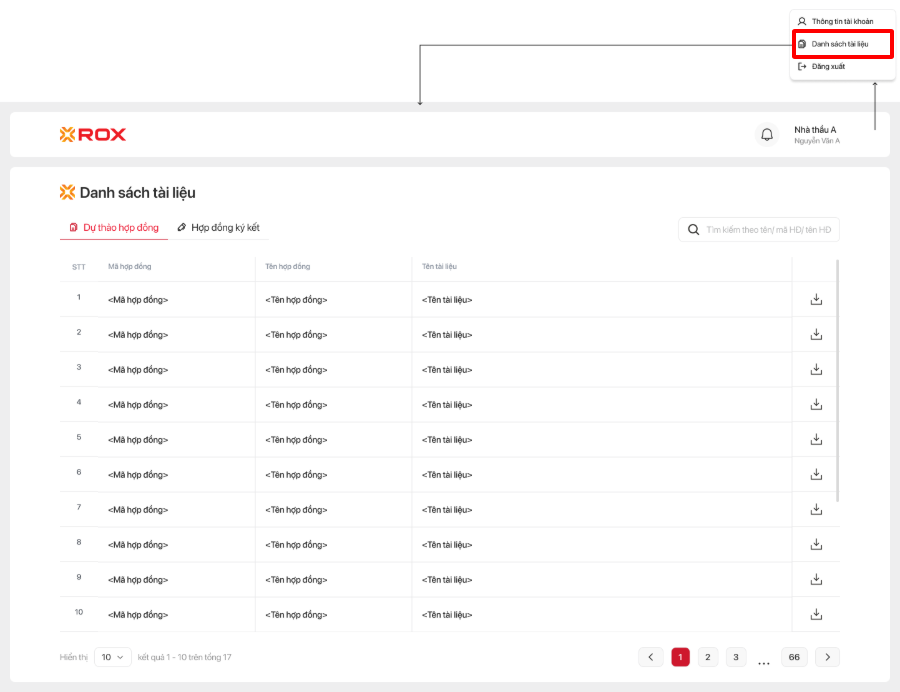 Bổ sung mục "Danh sách tài liệu" trong tùy chọn của Tên tài khoản (hiển thị ở góc trên bên phải giao diện)