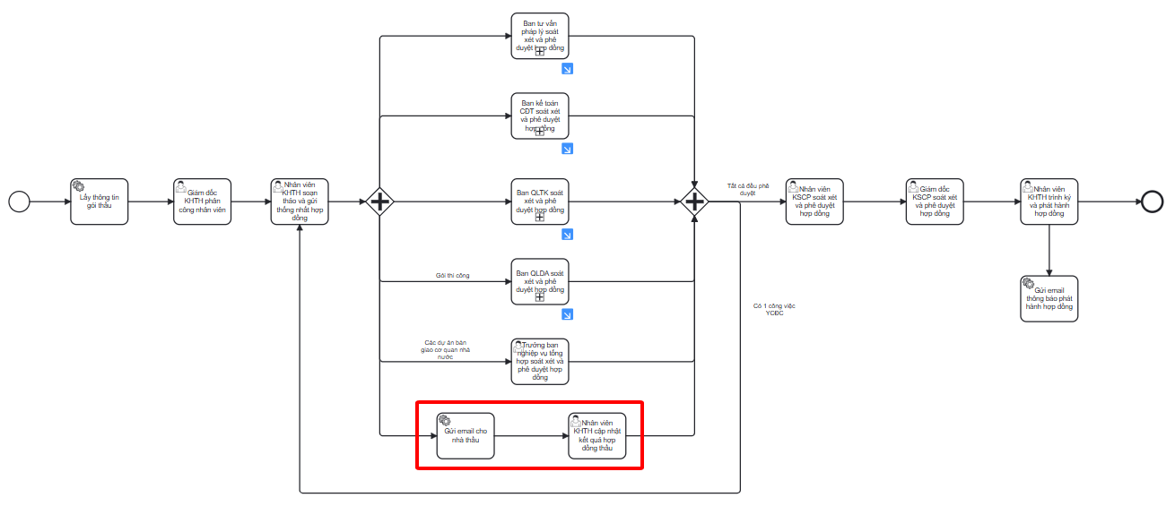 Sau khi thực hiện gửi email cho nhà thầu → Kích hoạt dây đi tiếp User task " Nhân viên KHTH cập nhật kết quả hợp đồng thầu"