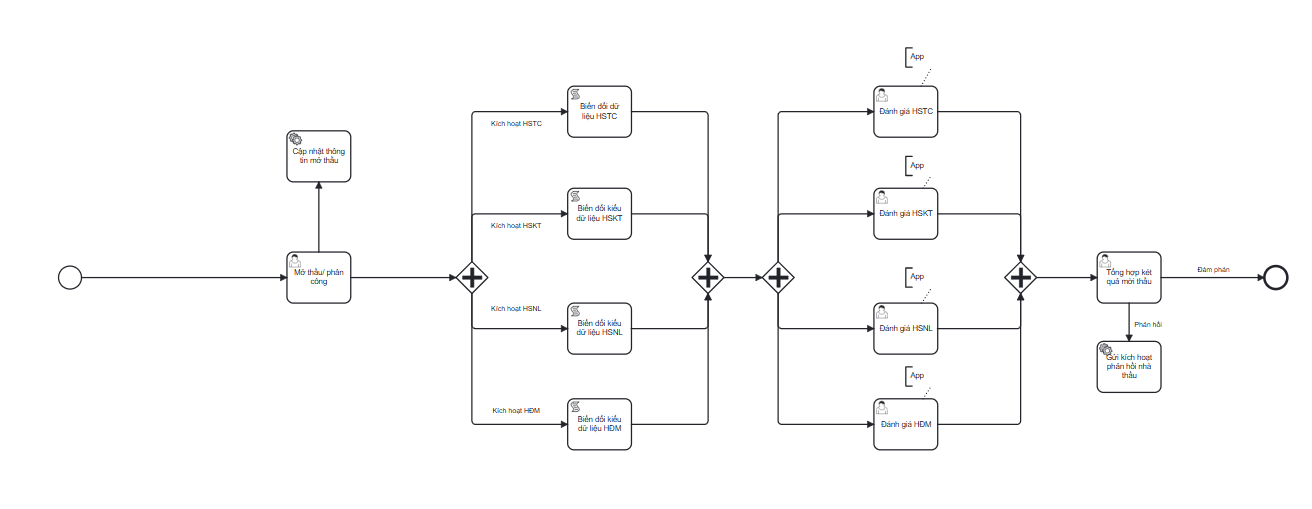 • Phản hồi kết quả đánh giá và tạo vòng nộp thầu mới: Mở vòng nộp thầu tiếp theo và quay lại bước Receive Task "Nộp thầu"