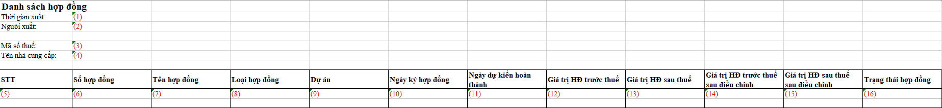 | 15 | Giá trị HĐ sau thuế sau điều chỉnh | Thể hiện thông tin giá trị HĐ sau thuế sau điều chỉnh của hợp đồng |