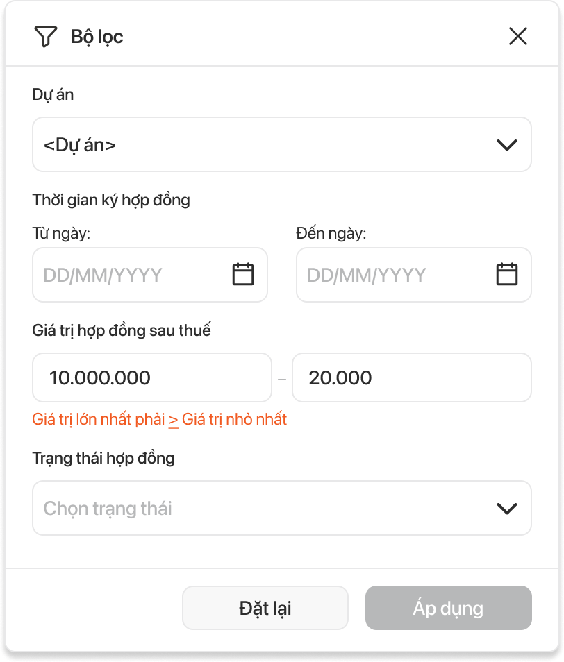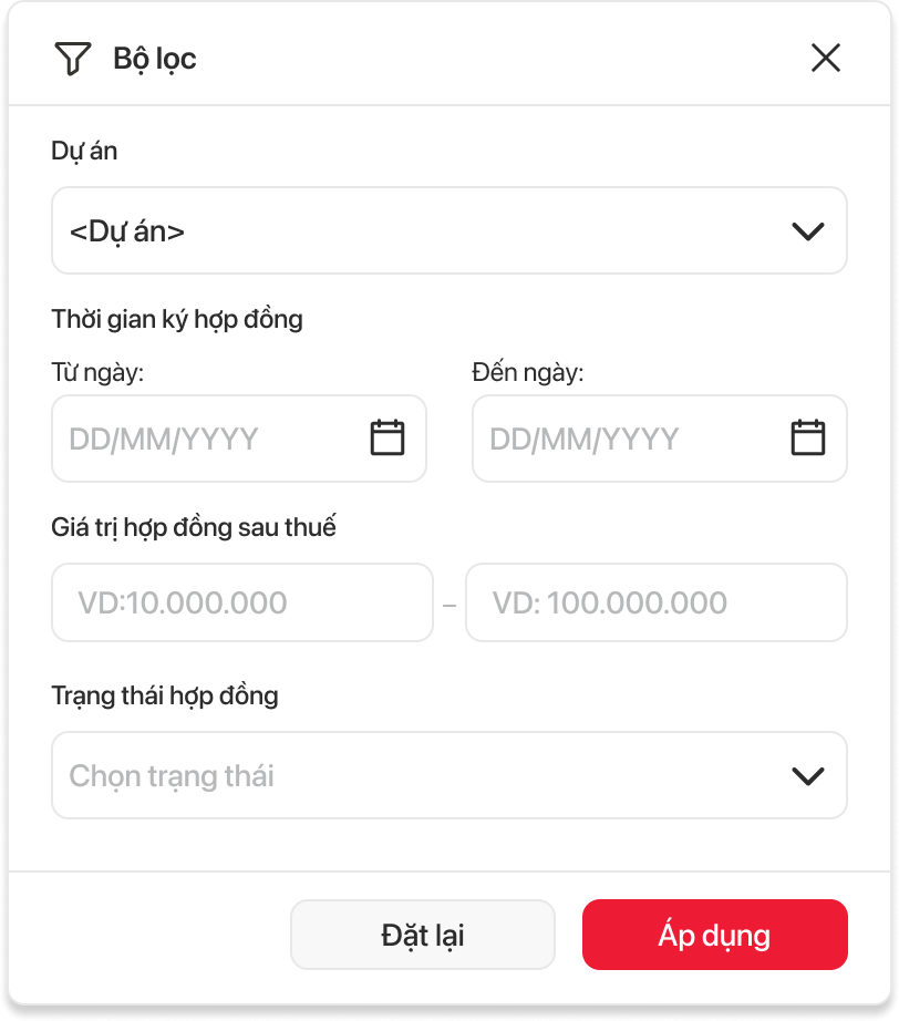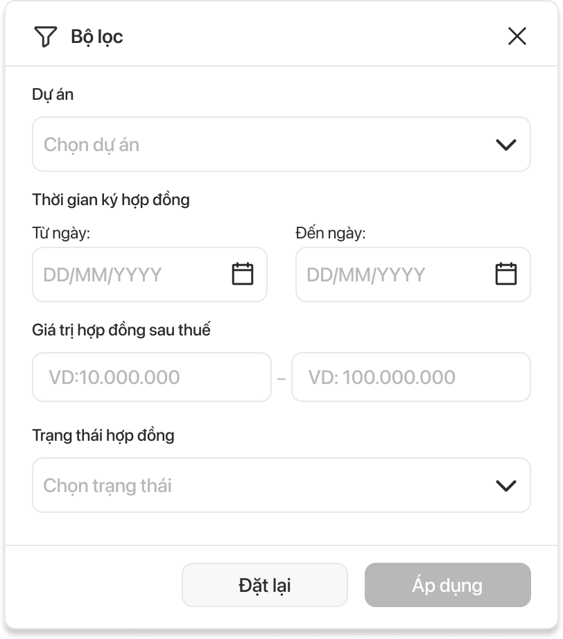 | 9 | Nút "Áp dụng" | Nút chức năng (Button) | Không bắt buộc | - Sau khi nhấn nút, hệ thống thực hiện lọc danh sách hợp đồng theo điều kiện nhập/chọn và đóng pop-up "Bộ lọc" - Hệ thống disable nút "Áp dụng" nếu người dùng không nhập/chọn điều kiện lọc - Hành vi hiển thị kết quả hệ thống khi người dùng nhấn nút "Áp dụng" như sau: