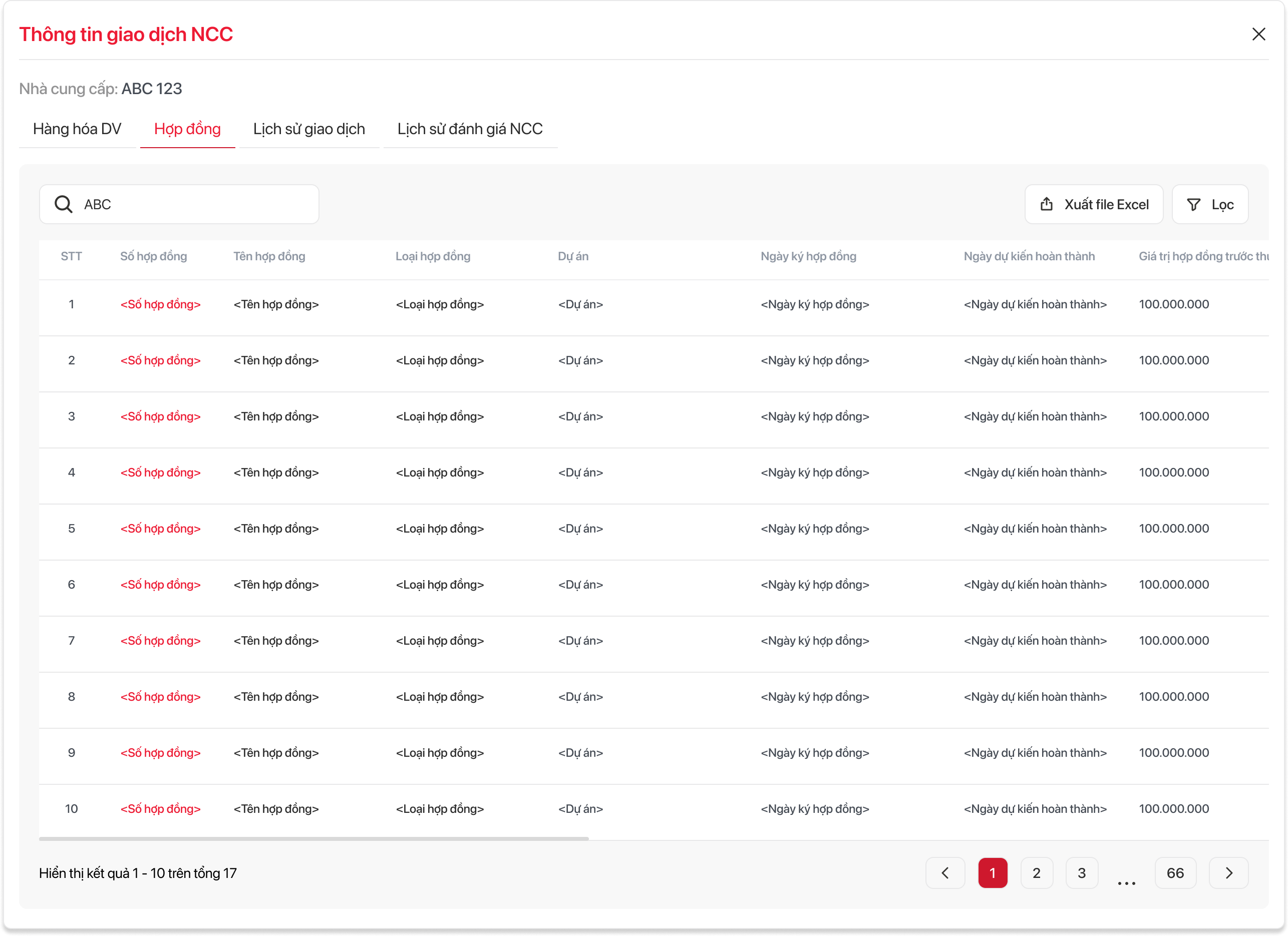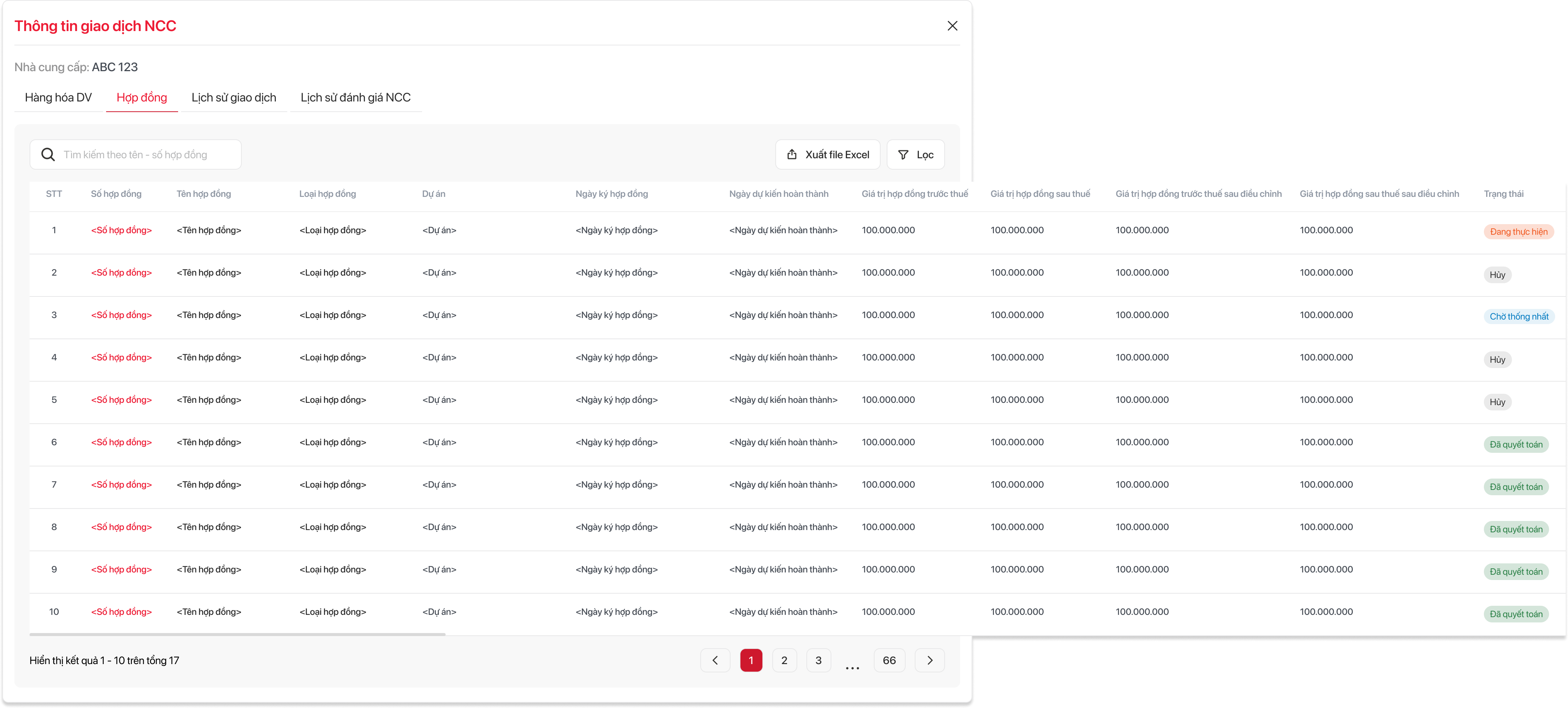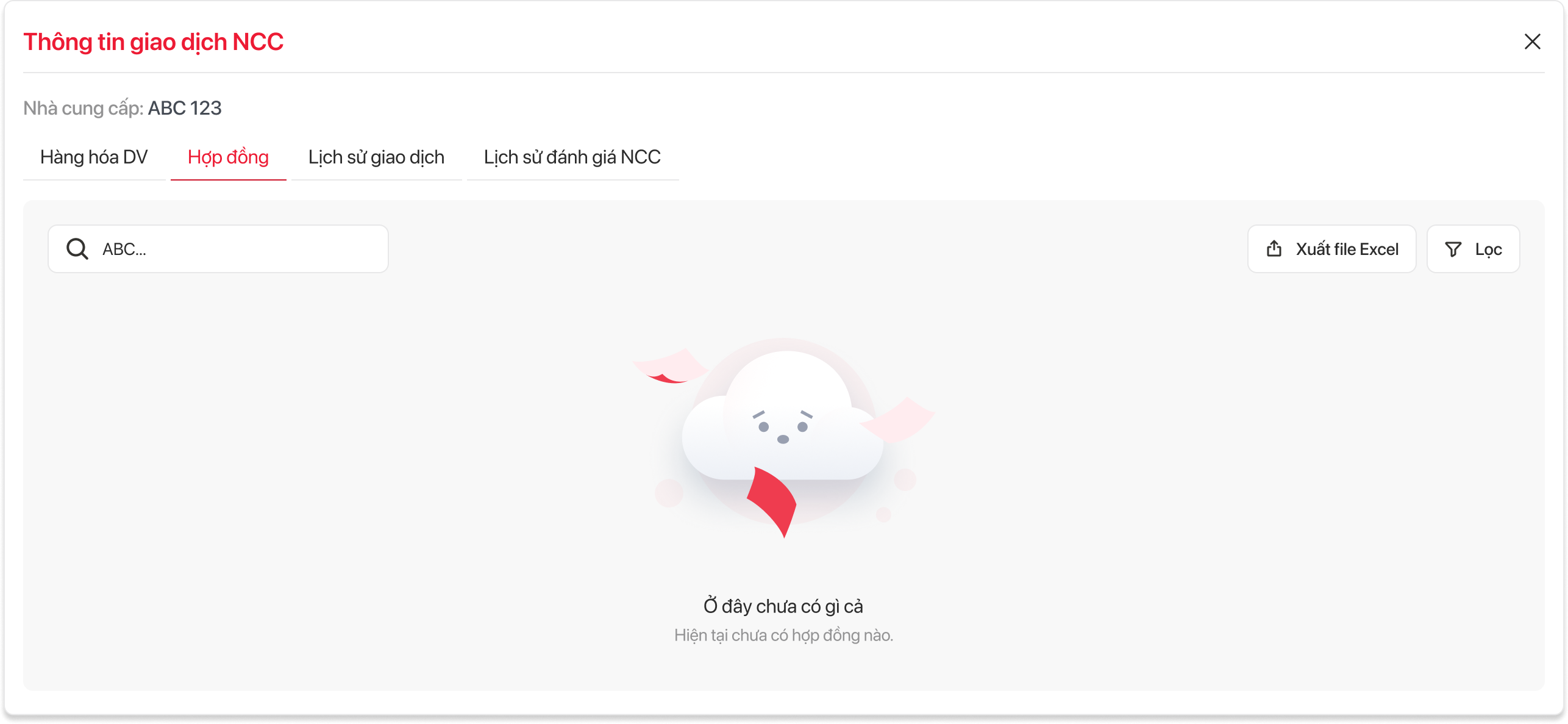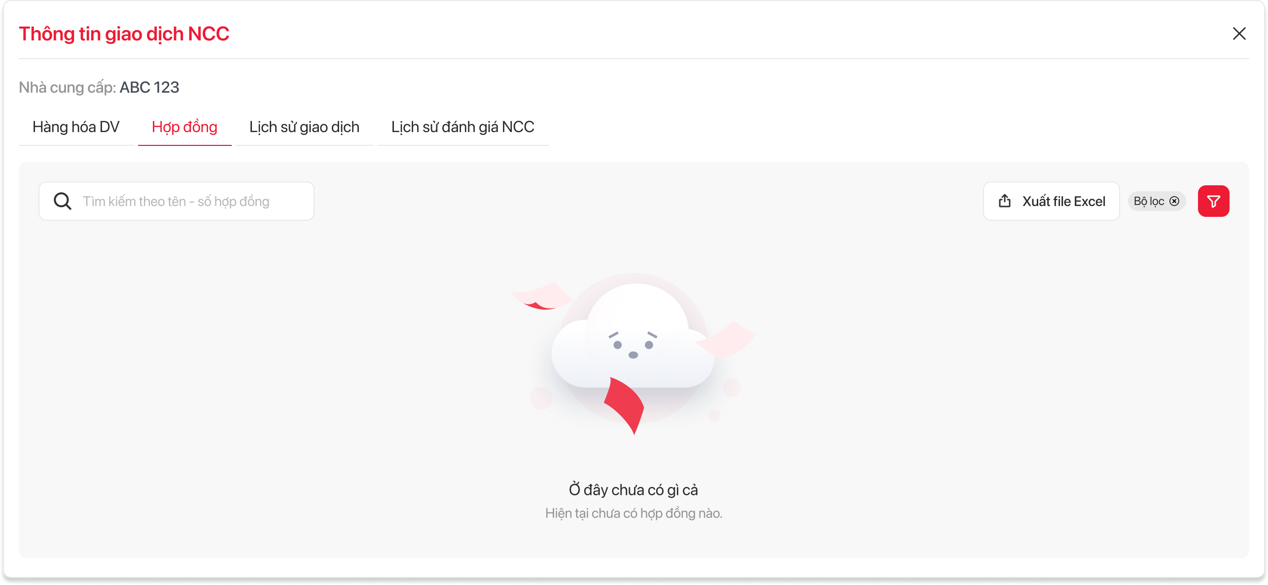 Tại màn hình danh sách nhà cung cấp, chọn để mở pop-up Thông tin giao dịch NCC, chọn Tab Hợp đồng (bên trái Tab Lịch sử giao dịch, Lịch sử đánh giá nhà cung cấp) để mở danh sách các hợp đồng của nhà cung cấp: