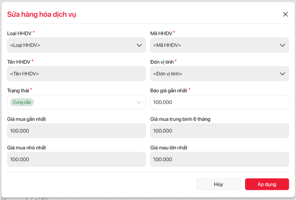 - Trạng thái: Cung cấp/Ngừng cung cấp