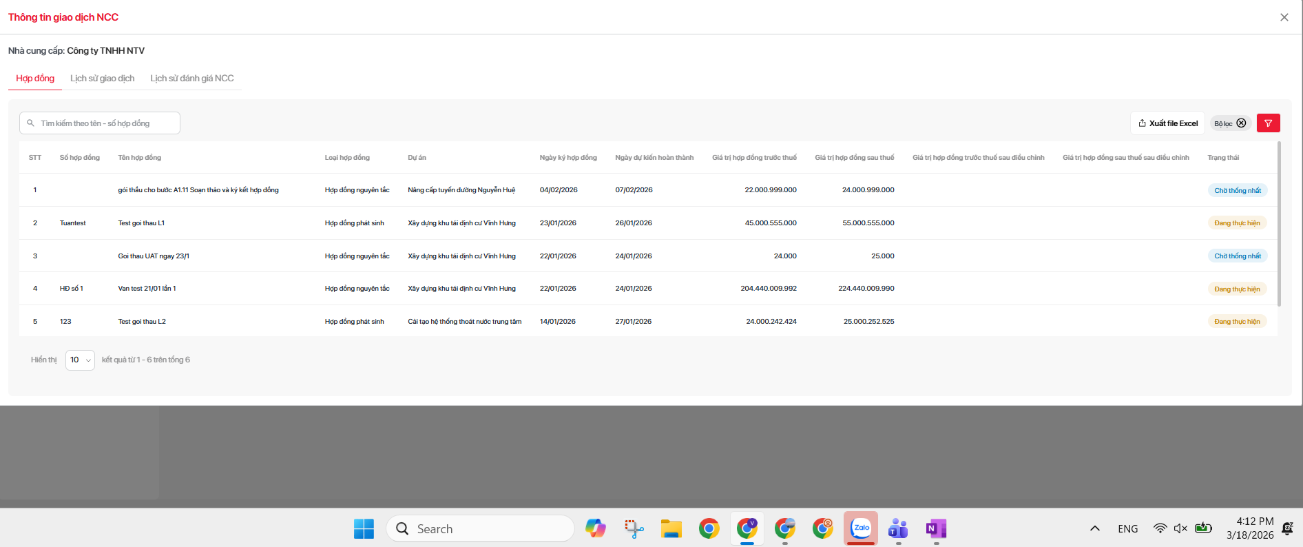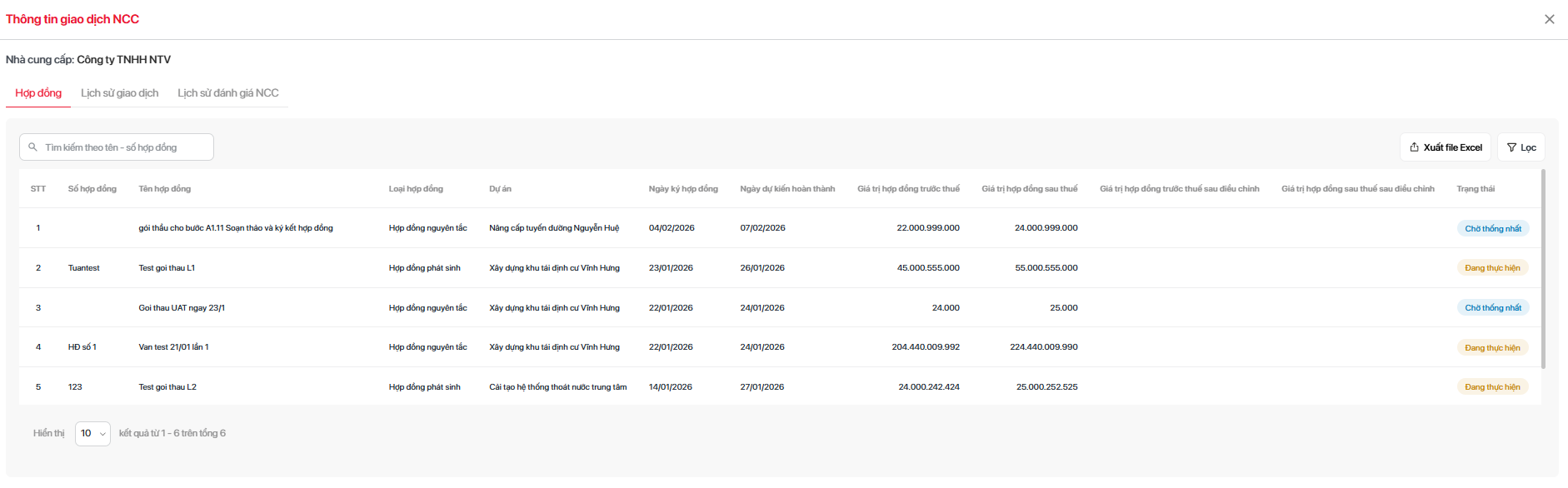 - 6 tháng gần nhất: tổng các hợp đồng của nhà cung cấp có Ngày ký hợp đồng trong 6 tháng gần nhất đến ngày hiện tại