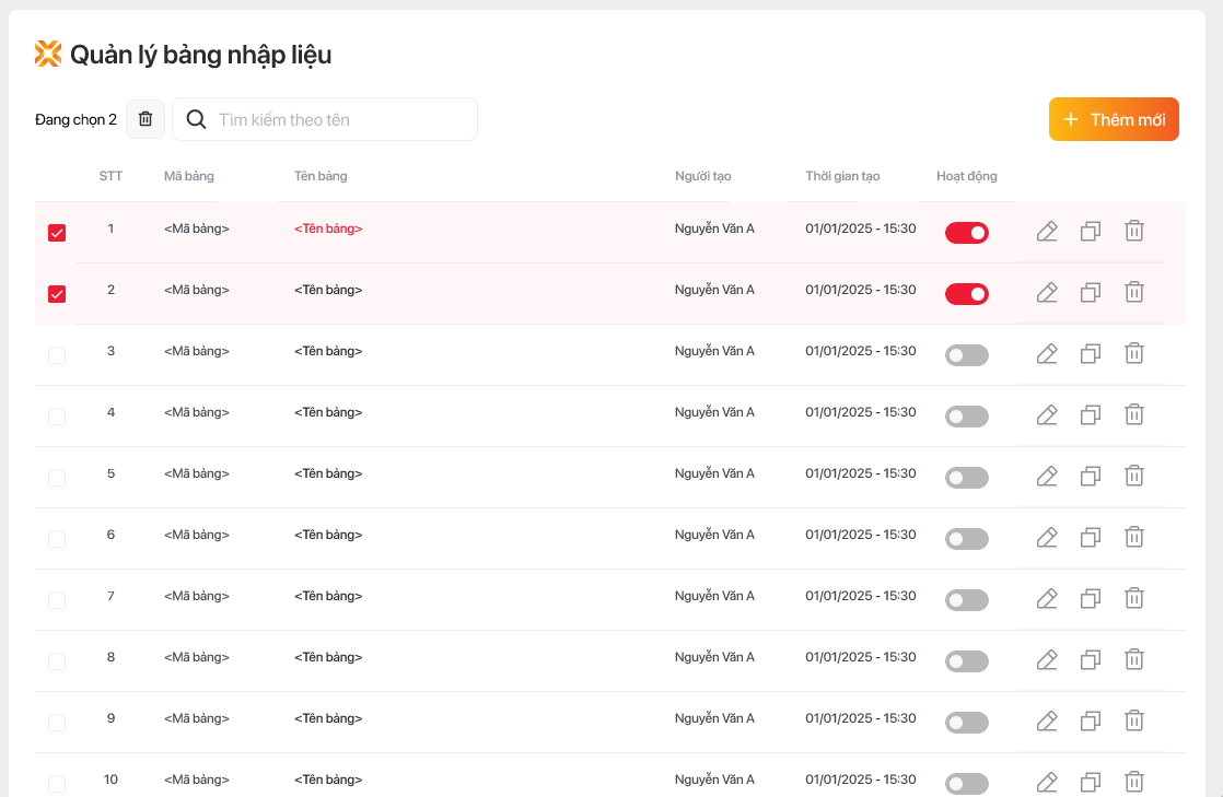 - Tại màn hình danh sách Bảng nhập liệu: Hiển thị nút chức năng "Thêm mới", "Sao chép"