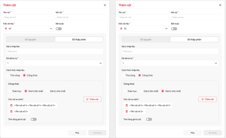 | 18 | Công thức - Lựa chọn: Giá trị lớn nhất | Text | Với lựa chọn công thức giá trị lớn nhất: Hệ thống cho phép người dùng lựa chọn các cùng định "Số" hoặc "Phần trăm" với cột đang khai báo Ví dụ: Cột đang khai báo kiểu dữ liệu là số → chỉ cho phép lựa chọn các cột so sánh định dạng số Từ đó khi nhập liệu hệ thống sẽ tự động so sánh các cột được cấu hình và đưa ra giá trị lớn nhất. Hệ thống cho phép: