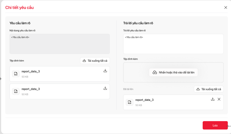 Chỉ hiển thị khi người dùng nhập nội dung "Trả lời yêu cầu làm rõ" hoặc đính kèm/điền ghi chú