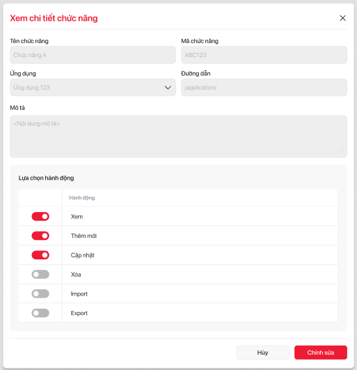 | 12 | Sửa | Button | Gọi popup Sửa danh sách chức năng | ||