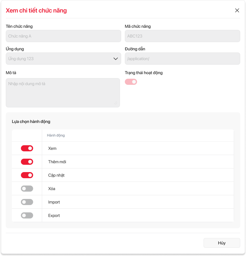| 8 | Xem | icon | Không bắt buộc | Cho phép tích chọn, bỏ tích chọn hành động | |
