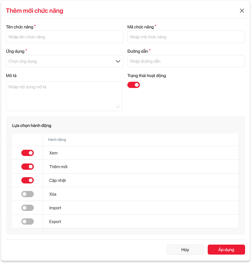 | 4 | Mã chức năng | Textbox | Bắt buộc | Nhập mã chức năng | |