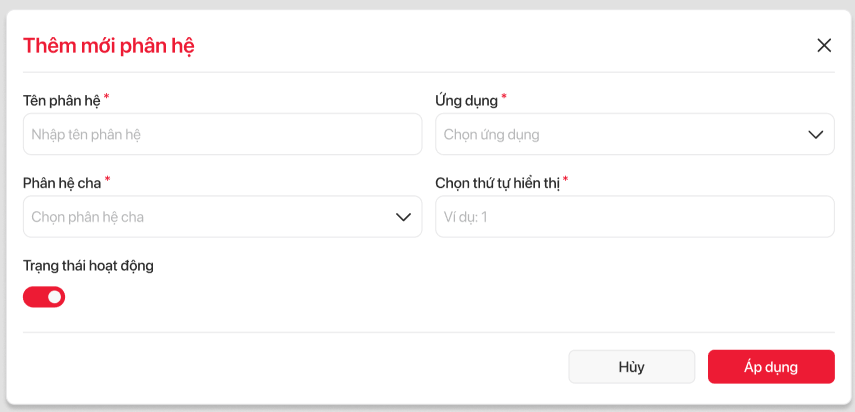 Popup thêm mới phân hệ hiển thị khi người dùng chọn Thêm mới trên Danh sách phân hệ
