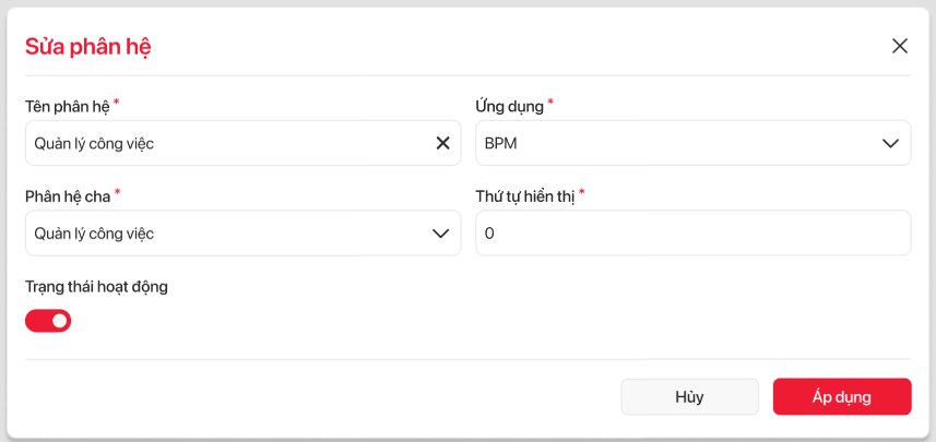 Popup chỉnh sửa phân hệ hiển thị khi người dùng chọn icon Sửa trên Danh sách phân hệ