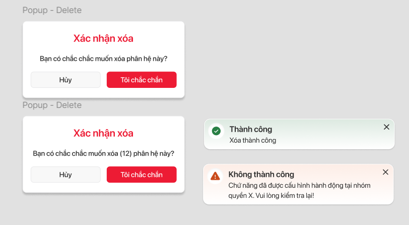 Popup Xác nhận hiển thị khi người dùng thực hiện Xóa 1 hoặc nhiều bản ghi đồng thời trên danh sách