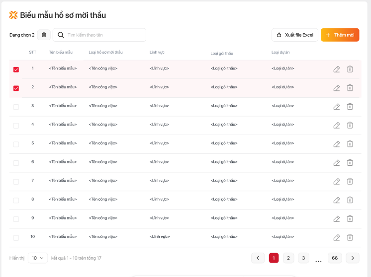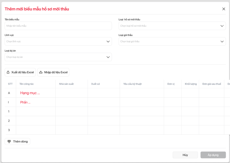 Chức năng cho phép người dùng tạo sẵn các biểu mẫu hồ sơ mời thầu (bao gồm dữ liệu công việc chi tiết) áp dụng cho theo tổ hợp các điều kiện: lĩnh vực, loại gói thầu, loại dự án.