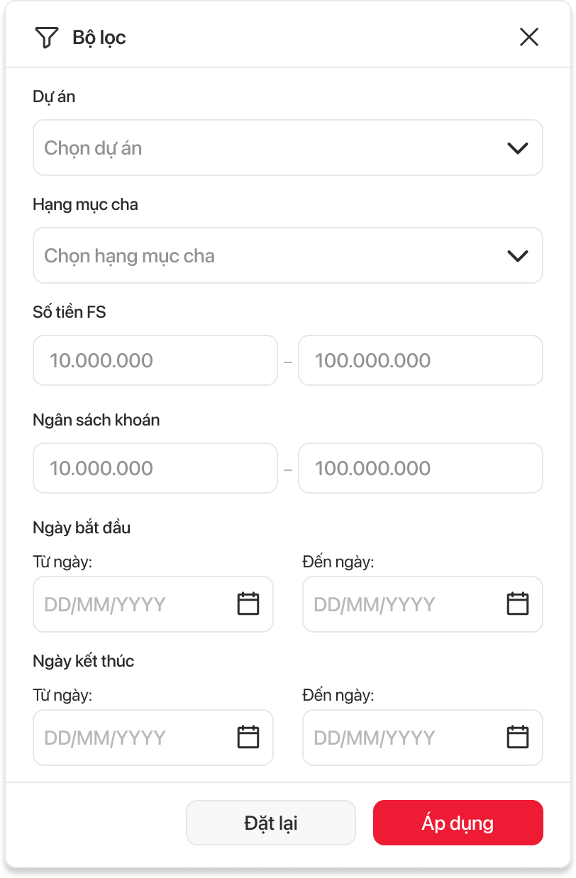 | Thể hiển hợp giá trị lớn nhất của khoảng giá trị của số tiền FS với placeholder: "VD: 100.000.000" |