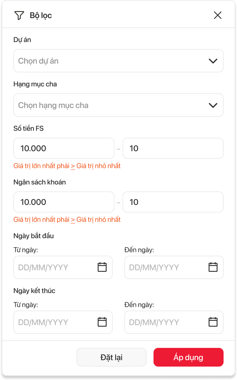- Trong trường hợp có dữ liệu tại trường Giá trị nhỏ nhất, khi nhập dữ liệu tại trường Giá trị lớn nhất, hệ thống hiển thị cảnh báo và disable nút "Áp dụng" đến khi Giá trị lớn nhất > Giá trị nhỏ nhất.