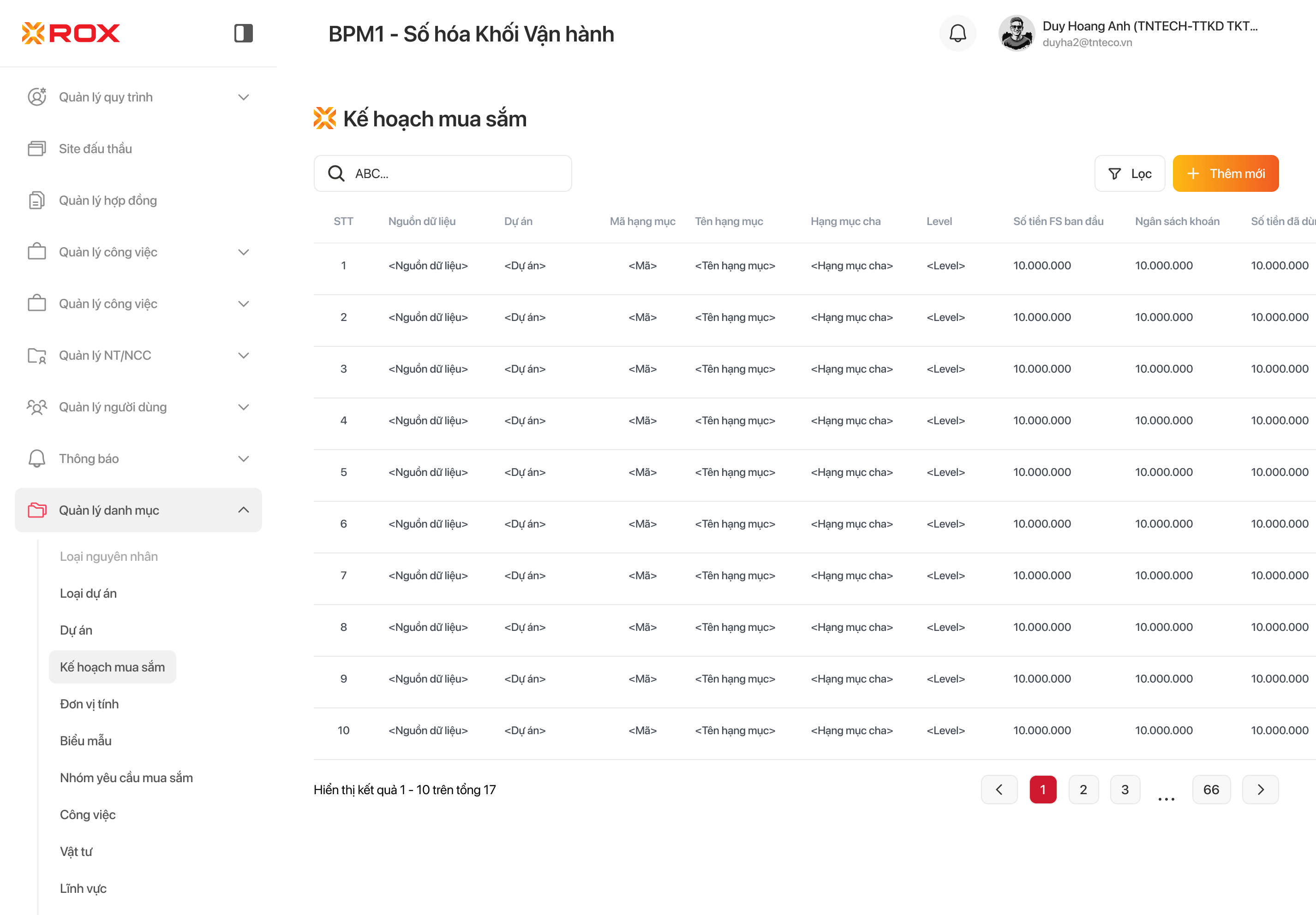 | 8 | Ngân sách khoán | Số (Number) | Không bắt buộc | - Không cho phép người dùng thao tác tương tác (nhấn/chọn/sửa). - Dữ liệu được lấy theo giá trị của trường "BUDGET" đồng bộ từ SAP | Thể hiện ngân sách khoán của hạng mục |