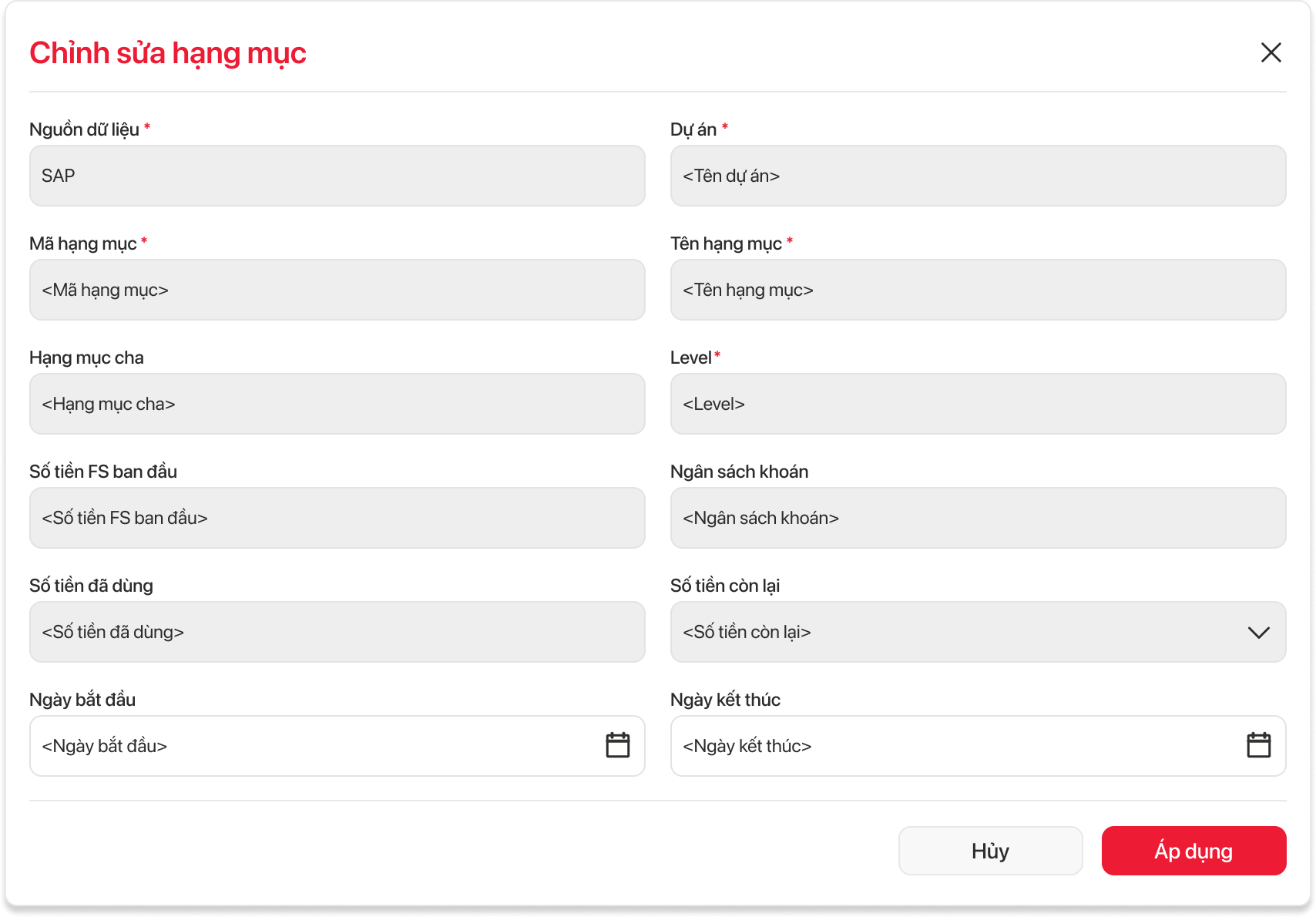 | 5 | Hạng mục cha | Văn bản (Text) | Không bắt buộc | - Không cho phép người dùng thao tác tương tác (nhấn/chọn/sửa). - Dữ liệu được lấy theo giá trị của trường "WBS_UP" đồng bộ từ SAP. | Thể hiện mã - tên hạng mục cha của hạng mục |