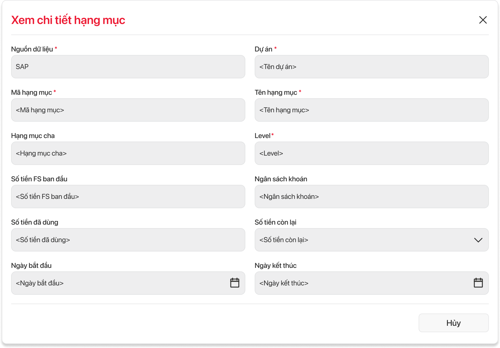 3.1.3. Màn hình pop-up "Xem chi tiết hạng mục" - Hạng mục được đồng bộ từ SAP