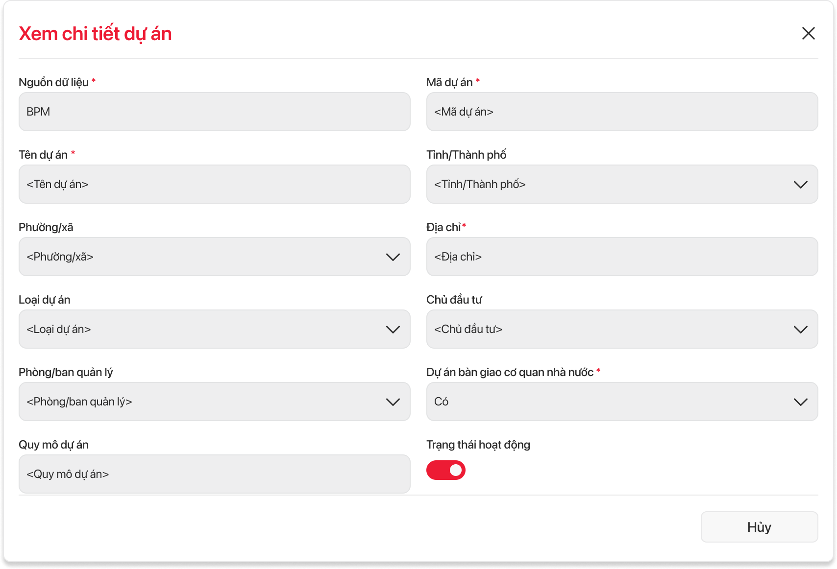 Thể hiện nút "Hủy" để hủy bỏ thao tác chỉnh sửa đơn 1 dự án.