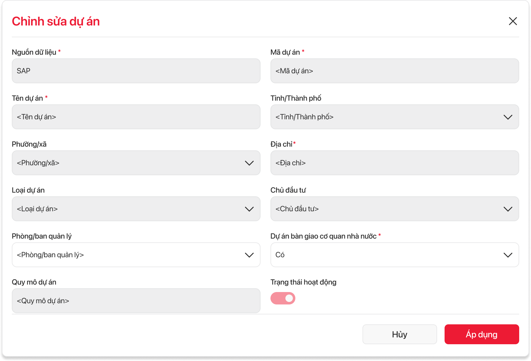 4. Dự án bàn giao cơ quan nhà nước: : Khi đồng bộ thông tin từ SAP về mặc định là Có và cho phép sửa