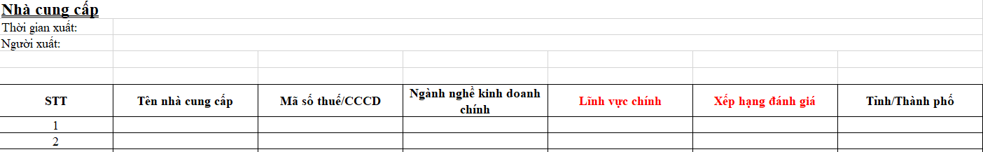 | 10 | Lĩnh vực chính | Lựa chọn (Select) | Không bắt buộc | Không cho phép thêm/sửa/xóa dữ liệu | Thể hiện trường lựa chọn (select) để khai báo thông tin lĩnh vực chính cho cả 2 loại nhà cung cấp:
