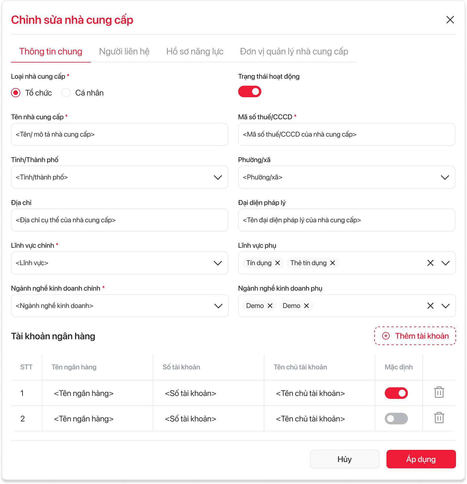 | 5 | Mặc định | Công tắc (Toggle/Switch) | Không bắt buộc | Không cho phép thêm/sửa/xóa dữ liệu | Thể hiện công tắc bật/tắt để xác định việc mặc định thông tin người liên hệ cho cả 2 loại nhà cung cấp: