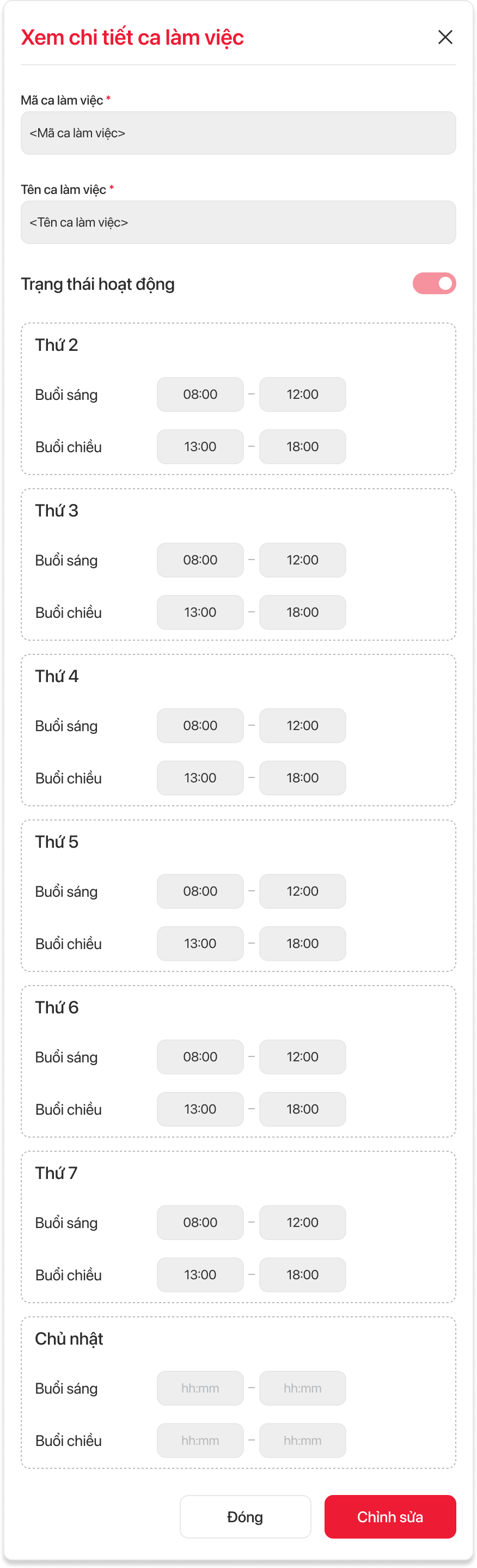 | 3 | Trạng thái hoạt động | Công tắc (Toggle) | Không bắt buộc | Không cho phép người dùng thao tác tương tác (nhấn/chọn/sửa). | Thể hiện công tắc với dữ liệu trạng thái hoạt động của ca làm việc hiện có, gồm: