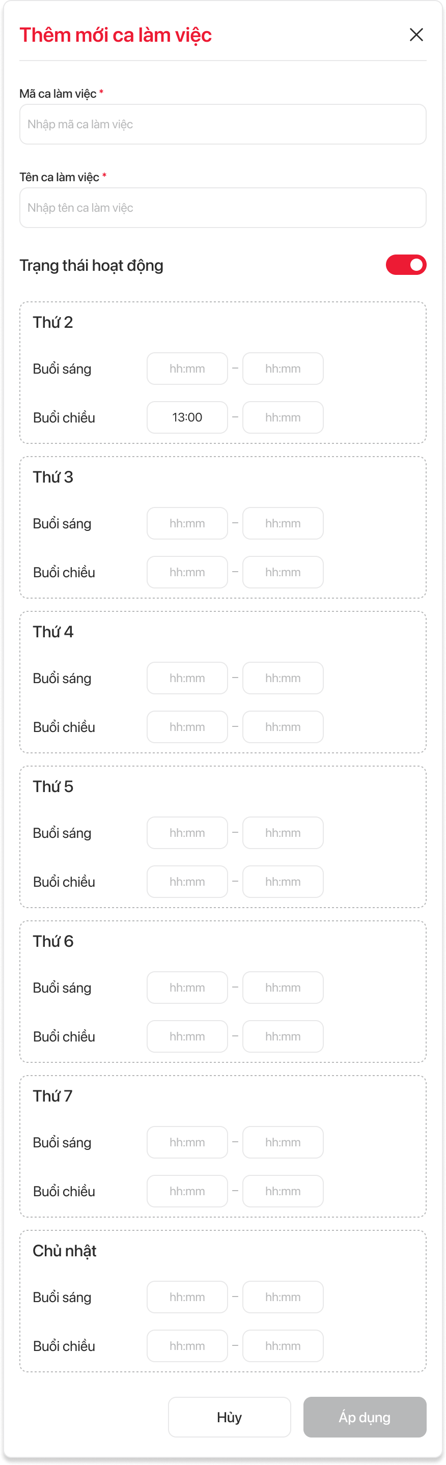 | 6 | Nút "Áp dụng" | Nút chức năng (Button) | Không bắt buộc | - Nút chỉ được kích hoạt khi người dùng đã hoàn thành nhập thông tin trường bắt buộc và tất cả các trường thời gian theo ngày (Thứ 2 → Chủ Nhật) cần chỉnh sửa một cách hợp lệ. - Khi nhấn hệ thống tiến hành xác nhận dữ liệu ca làm việc khi chỉnh sửa như sau: