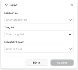 Loại đánh giá | Droplist | x | -Cho phép chọn 1 trong 3 loại đánh giá ứng với mỗi lĩnh vực kinh doanh, không cho phép người dùng được chọn lại loại đánh giá trùng với lĩnh vực kinh doanh đã chọn lần trước · 1: Đánh giá lần đầu · 2: Đánh giá sau sử dụng · 3: Đánh giá định kỳ Cấu hình động trên hệ thống | Thể hiện thông tin loại đánh giá áp dụng cho thang điểm VD: Lần 1 chọn đánh giá lần đầu ứng với lĩnh vực XDCB -> lần 2 chỉ được phép chọn đánh giá sau sử dụng/ đánh giá định kỳ của lĩnh vực XDCB |