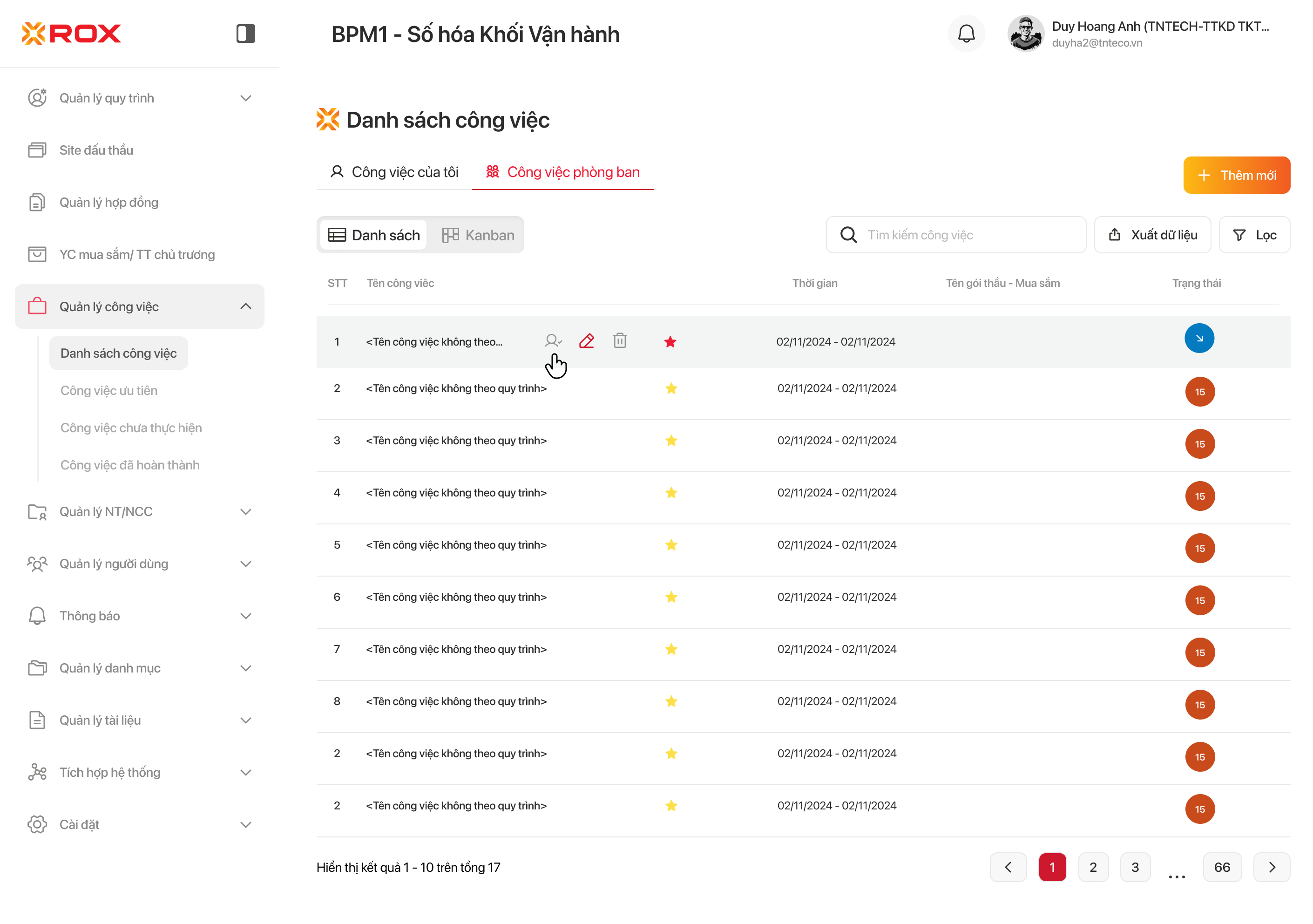- Phân quyền thực hiện chức năng được cấu hình theo quyền sửa của danh mục Công việc phòng ban